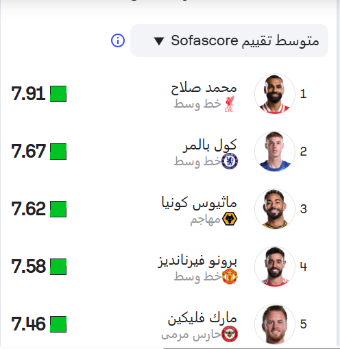 ووفقًا لموقع "سوفا سكور" العالمي، حصل محمد صلاح على 7.91 – 10 في التقييم الذي أعده عن مستويات لاعبي الدوري الإنجليزي الممتاز "البريميرليج" هذا الموسم، متفوقًا على كول بالمر لاعب تشيلسي صاحب المرتبة الثانية بتقييم 7.67 – 10.