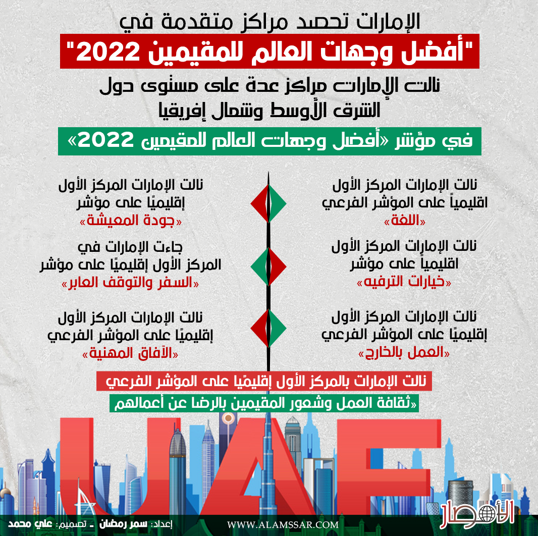 نالت الإمارات مراكز عدة على مستوى دول الشرق الأوسط وشمال إفريقيا في مؤشر «أفضل وجهات العالم للمقيمين 2022»