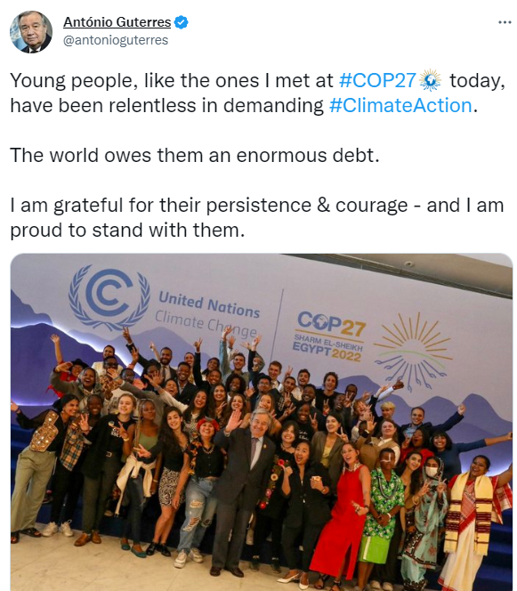 وقال جوتيريش فى تغريدة عبر حسابه الرسمي بتويتر: "الشباب، مثل أولئك الذين قابلتهم فىCOP27 اليوم، كانوا بلا هوادة في المطالبة بإجراء للحد من التغير المناخى، العالم مدين لهم بدين هائل".