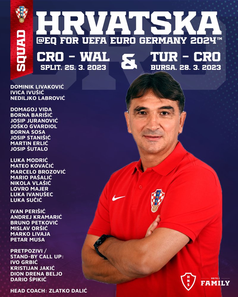 أعلن زلاتكو داليتش، المدير الفني لمنتخب كرواتيا، القائمة الرسمية لمواجهتي ويلز وتركيا، في إطار منافسات تصفيات كأس الأمم الأوروبية يورو 2024، والتي شهدت تواجد النجم الكرواتي لوكا مودريتش لاعب وسط ريال مدريد الإسباني.