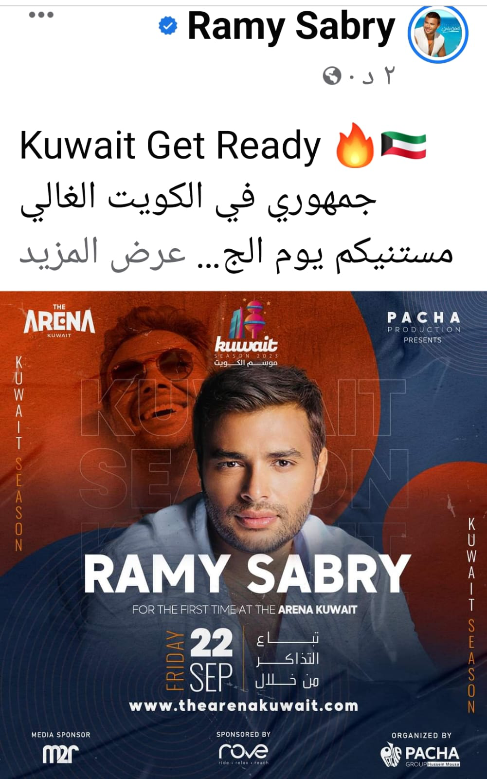 روج الفنان رامى صبري لحفلته المقبلة بالكويت التى موعدها يوم الجمعه المقبلة الموافق 22 سبتمير حيث نشر على صفحته بموقع التواصل الاجتماعى فيس بوك .