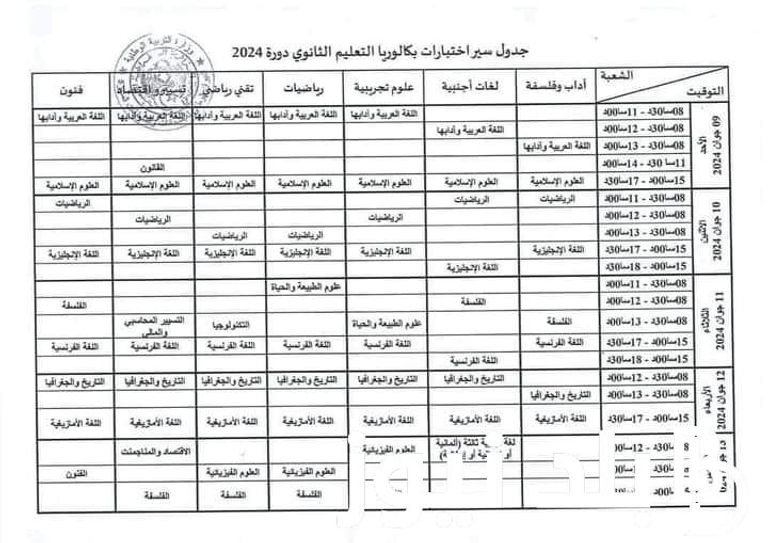 وأعدت وزارة التربية الوطنية في الجزائر، جدولاً تفصيلياً لسير امتحانات البكالوريا، والذي يمكن للطلاب الاطلاع عليه لضمان معرفة مواعيد جميع المواد وتوقيتاتها.