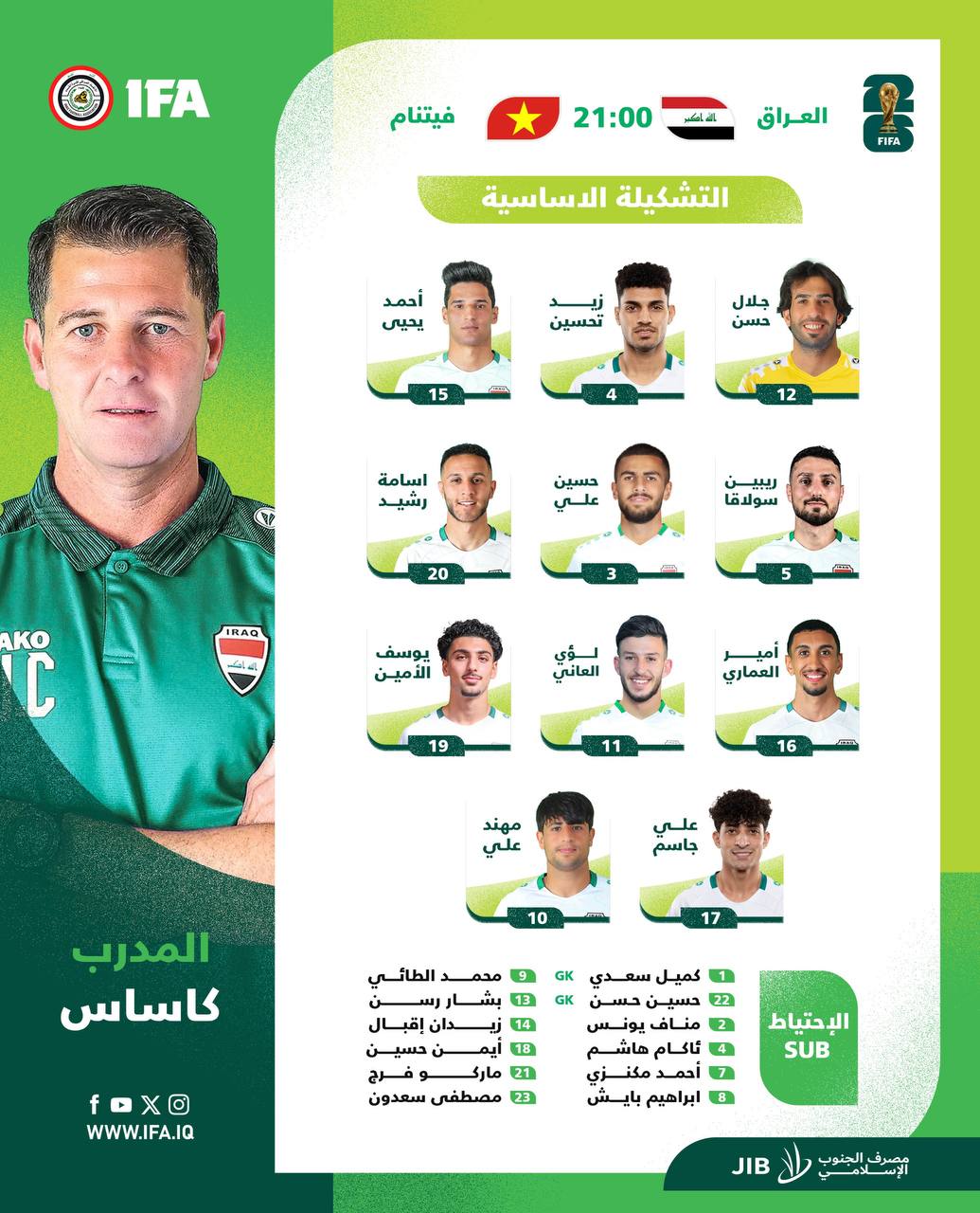 أعلن خيسوس كاساس المدير الفني لمنتخب العراق التشكيل الرسمي لمواجهة منتخب فيتنام، في المواجهة التي تقام في تمام الساعة التاسعة مساءً بتوقيت القاهرة ومكة المكرمة، ضمن تصفيات آسيا لكأس العالم 2026 وكأس آسيا 2027.