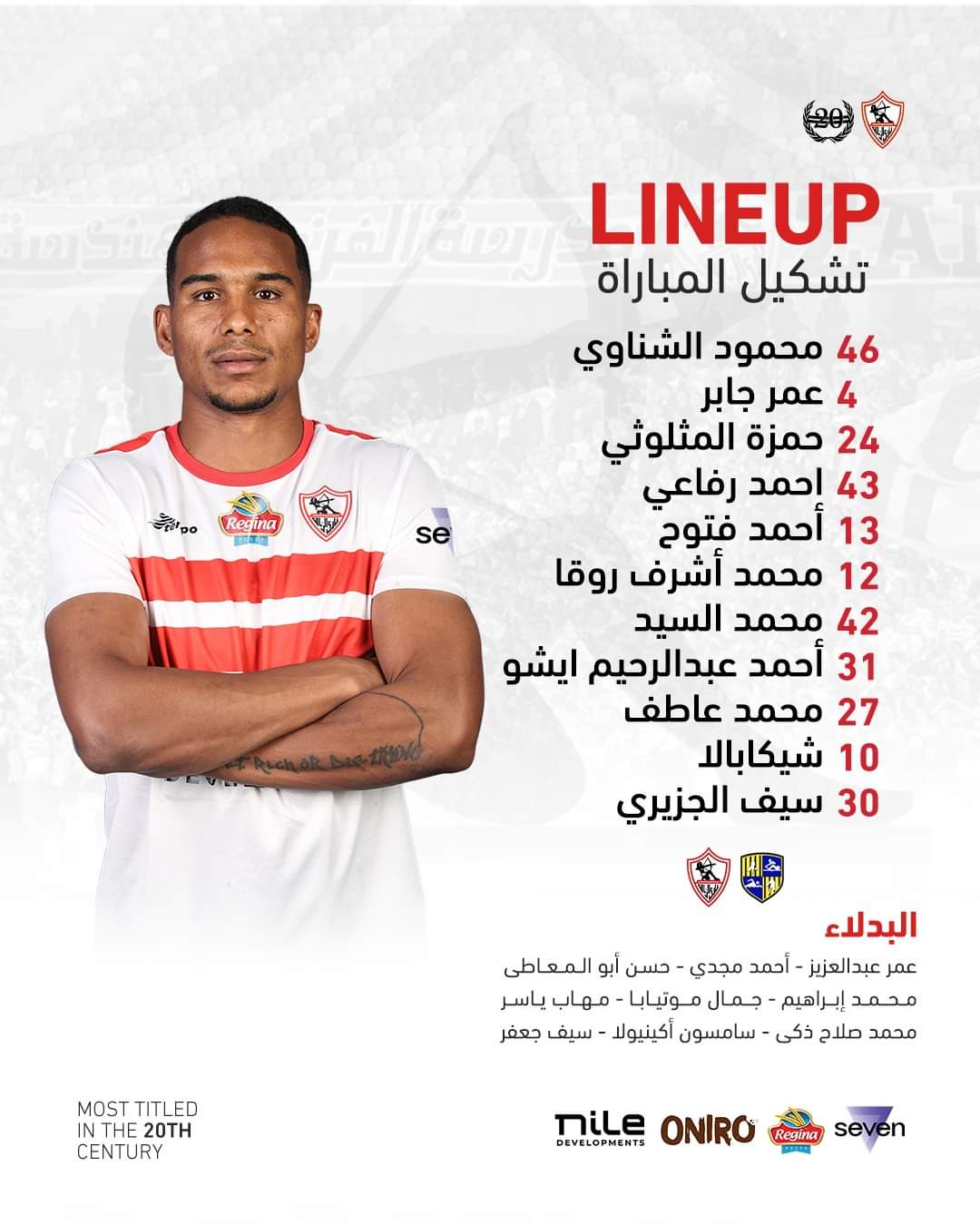 ويتواجد على مقاعد البدلاء، عمر عبد العزيز وأحمد مجدي وحسن أبو المعاطي ومحمد إبراهيم وسيف جعفر وجمال موتيابا ومهاب ياسر ومحمد صلاح ذكي وسامسون أكينيولا.