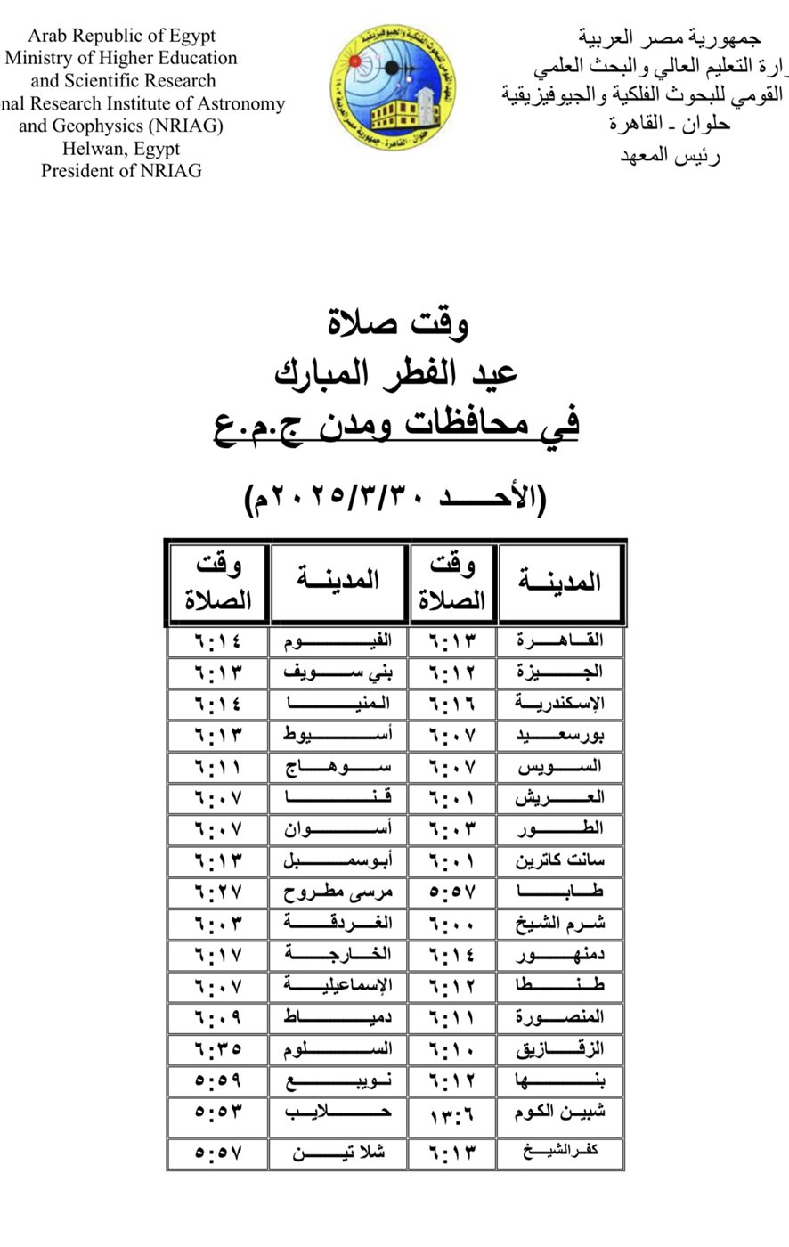 وجاءت مواعيد صلاة عيد الفطر المبارك في المحافظات المصرية كالتالي: