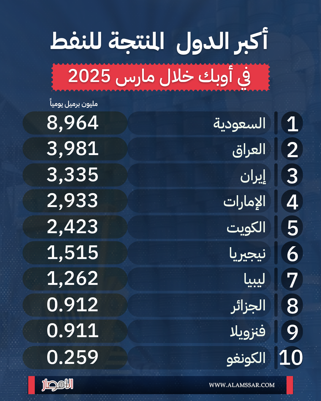 انفو جراف |أكبر الدول المنتجة للنفط في أوبك خلال مارس 2025