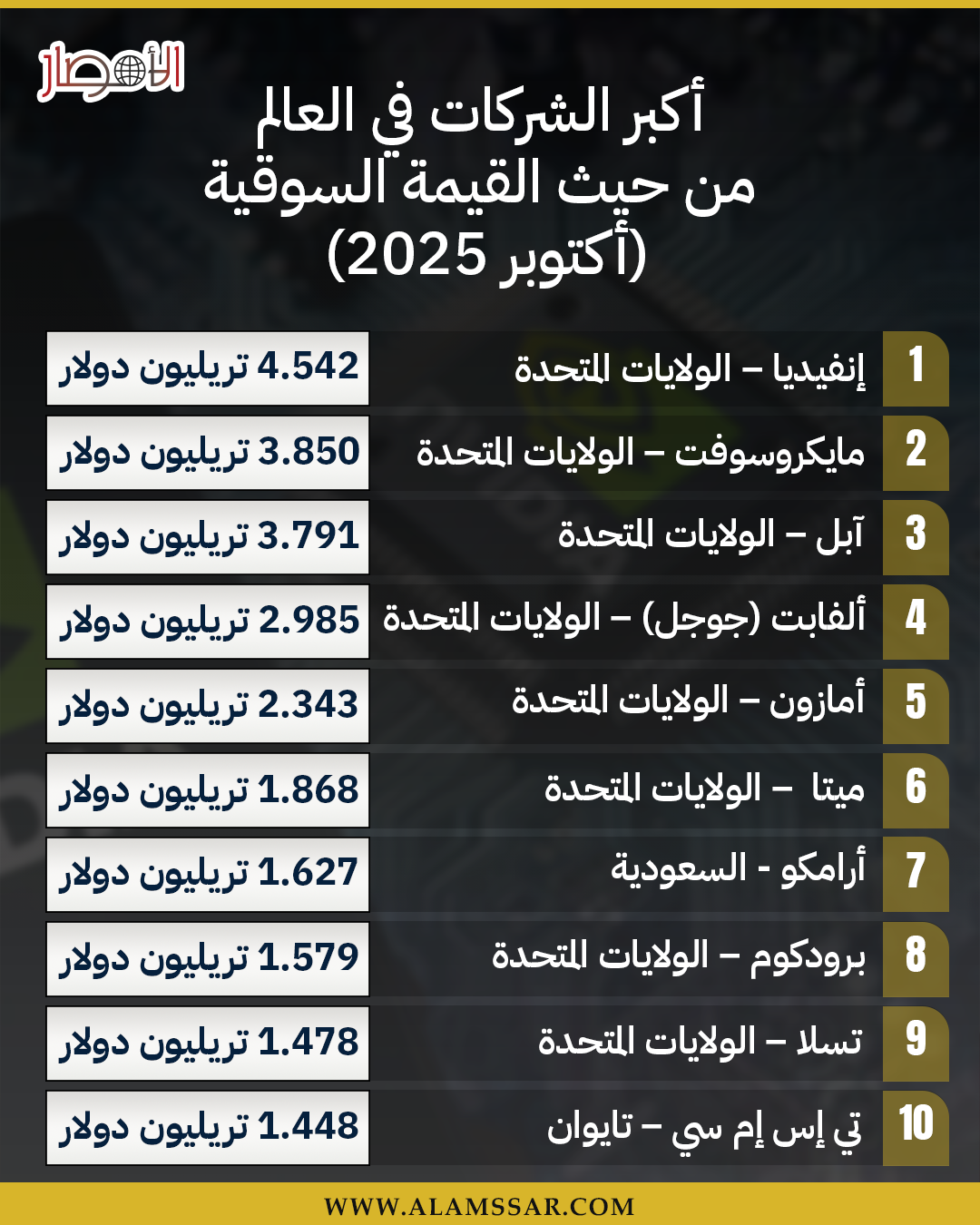 انفوجراف.. أكبر الشركات في العالم من حيث القيمة السوقية خلال أكتوبر 2025