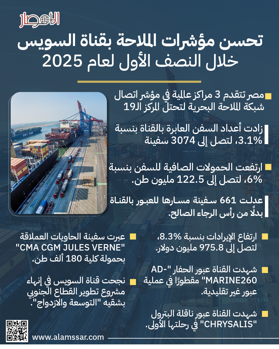 بالإنفوجراف.. تحسن مؤشرات الملاحة بقناة السويس خلال النصف الأول لعام 2025