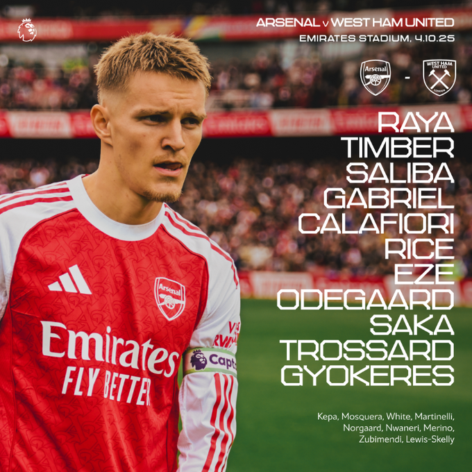 أعلن المدرب الإسباني ميكيل أرتيتا، المدير الفني لنادي أرسنال الإنجليزي، عن التشكيل الرسمي لفريقه الذي سيخوض مواجهة وست هام يونايتد، في الخامسة مساء اليوم السبت، على ملعب الإمارات، ضمن منافسات الجولة السابعة من الدوري الإنجليزي الممتاز.