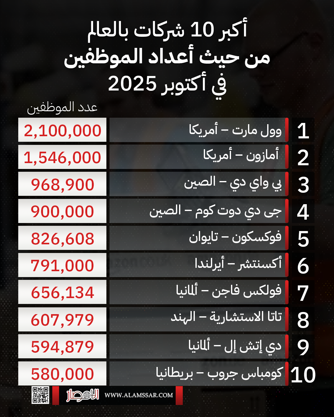 بالإنفوجراف| أكبر 10 شركات بالعالم من حيث أعداد الموظفين في أكتوبر 2025