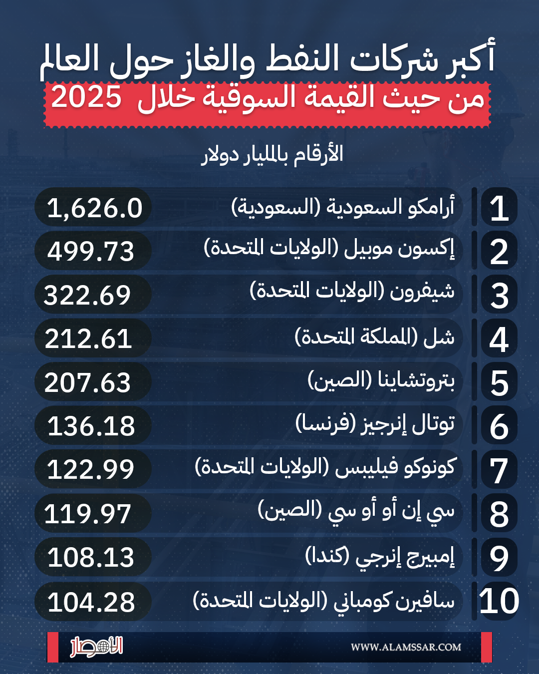 انفوجراف.. أكبر شركات النفط والغاز حول العالم من حيث القيمة السوقية خلال 2025