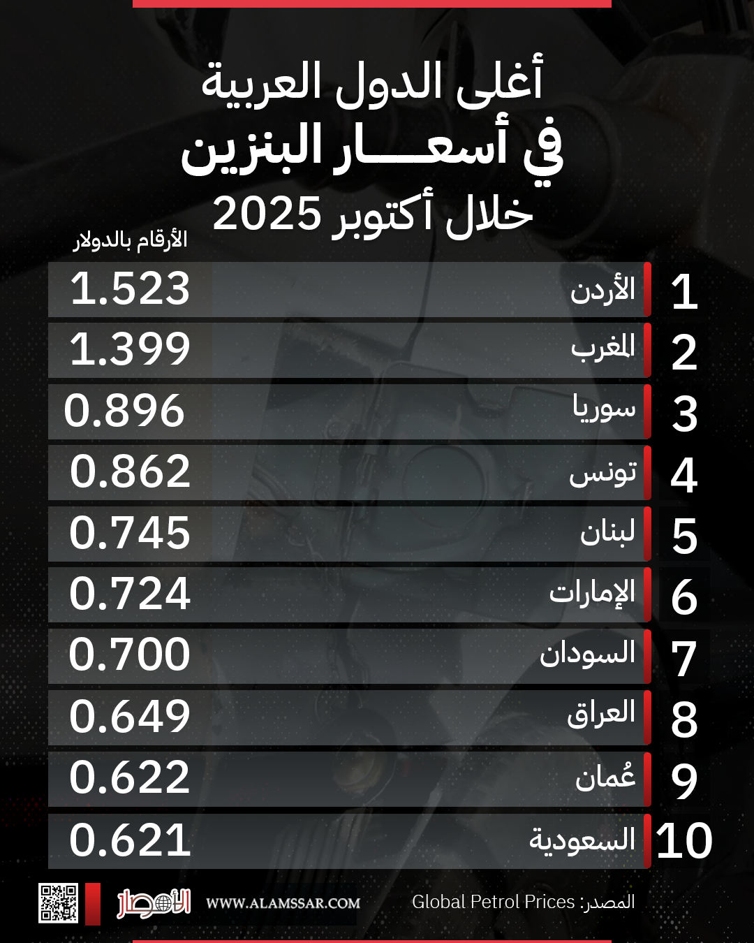 بالانفوجراف.. أغلى الدول العربية في أسعار البنزين خلال أكتوبر 2025