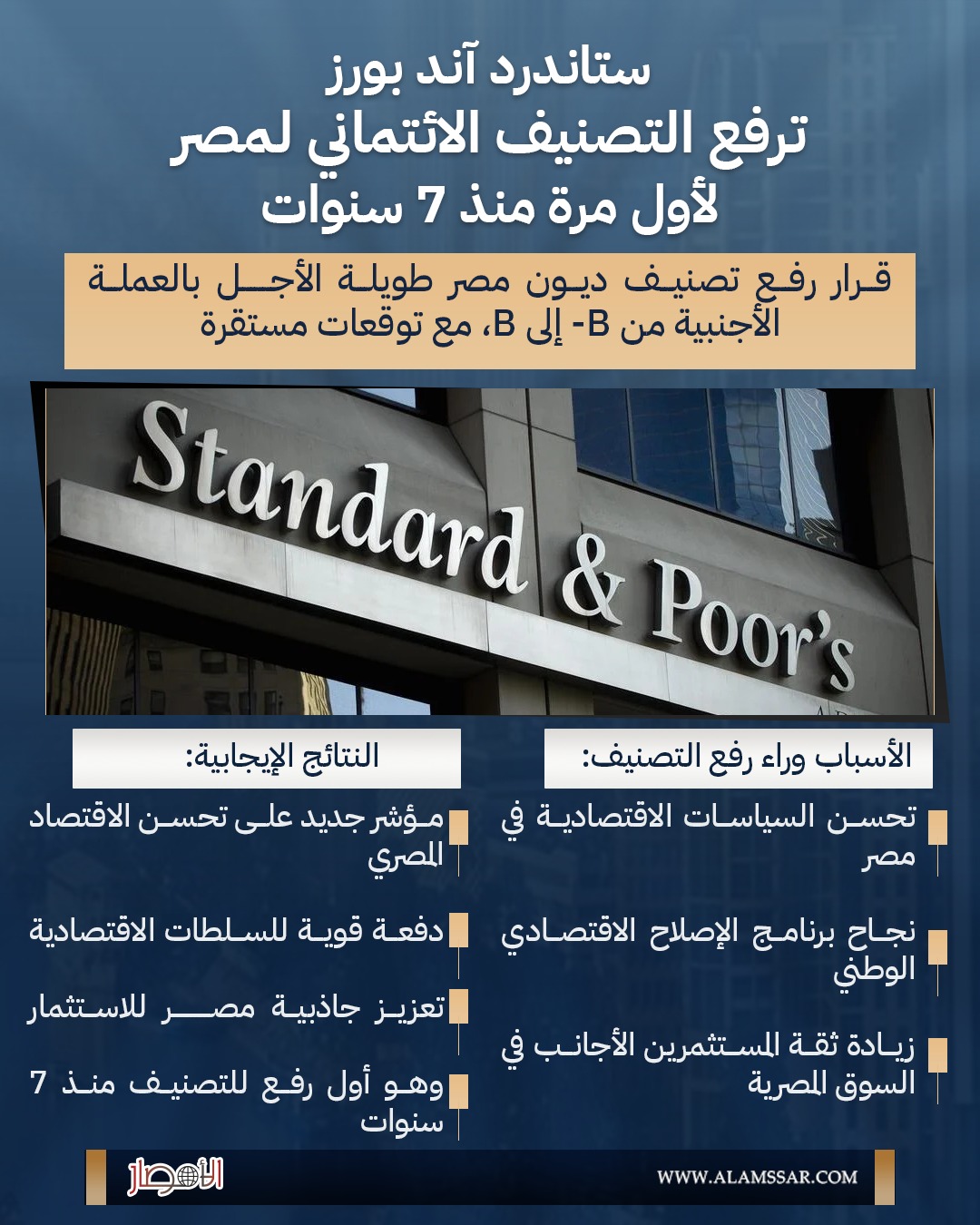 إنفوجراف| ستاندرد آند بورز ترفع التصنيف الائتماني لمصر لأول مرة منذ 7 سنوات
