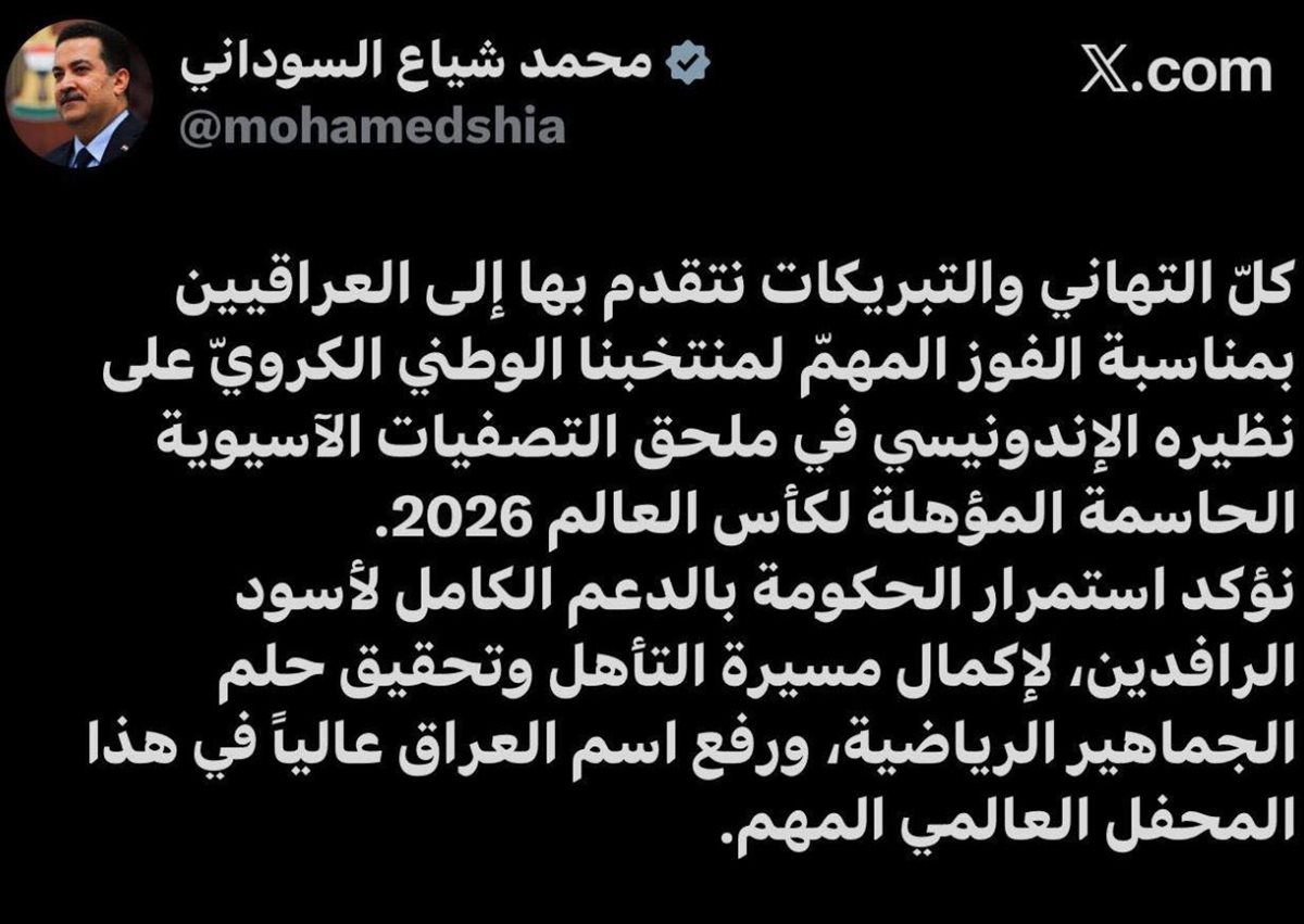أكد رئيس الوزراء العراقي، محمد شياع السوداني استمرار الحكومة في تقديم الدعم الكامل لمنتخب العراق الوطني لكرة القدم "أسود الرافدين"، بعد فوز الفريق على نظيره الإندونيسي في الملحق الآسيوي المؤهل لكأس العالم 2026.