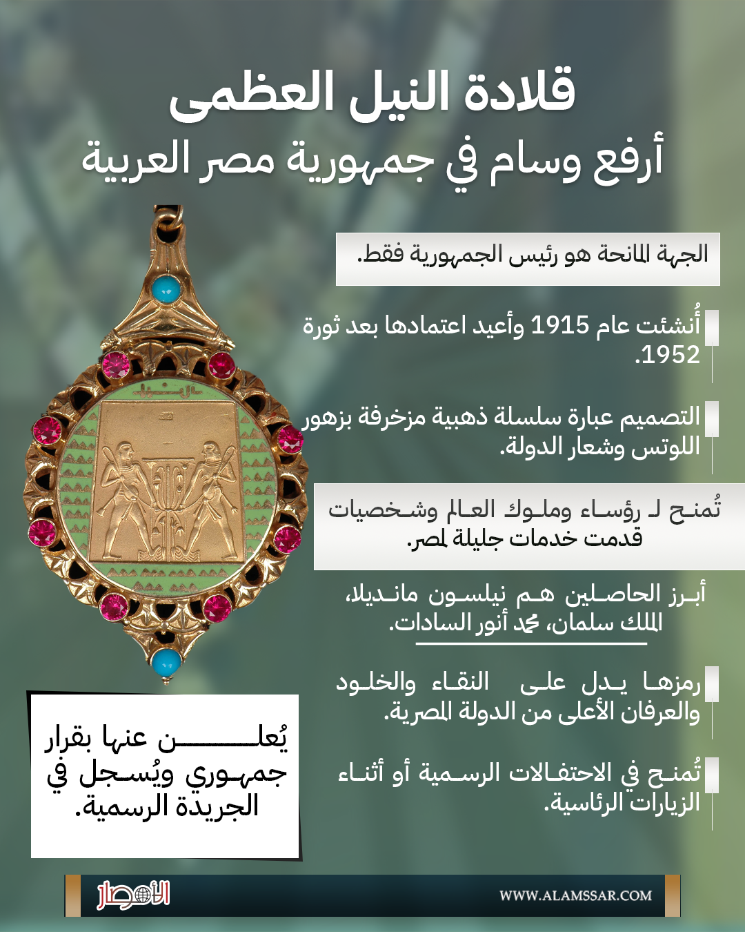 انفوجراف| قلادة النيل العظمى.. أرفع وسام في جمهورية مصر العربية