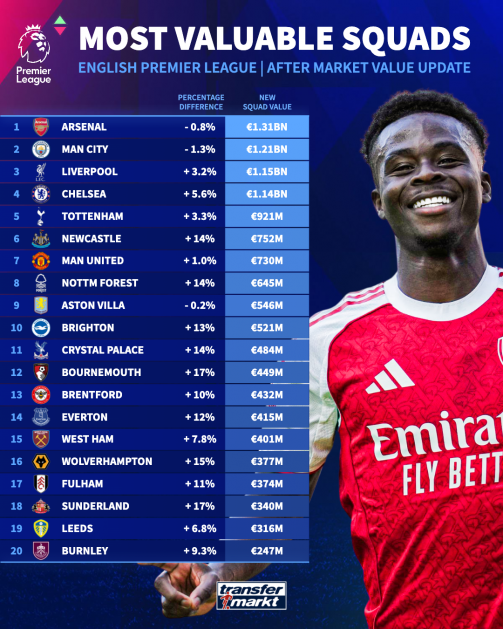 وجاءت أندية أرسنال ومانشستر سيتي وليفربول وتشيلسي في صدارة الترتيب كأغلى الفرق في المسابقة، بعدما تجاوزت قيمتها السوقية حاجز المليار يورو. واحتل أرسنال الإنجليزي المركز الأول بقيمة بلغت 1.31 مليار يورو، متفوقاً على غريمه مانشستر سيتي الذي بلغت قيمته 1.21 مليار يورو، فيما حل ليفربول – الذي يضم النجم المصري محمد صلاح – ثالثاً بقيمة 1.15 مليار يورو، وجاء تشيلسي رابعاً بـ 1.14 مليار يورو.