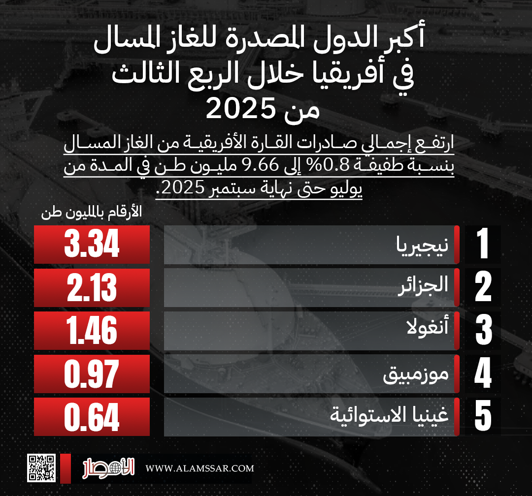 انفوجراف| أكبر الدول المصدرة للغاز المسال في أفريقيا خلال الربع الثالث من 2025