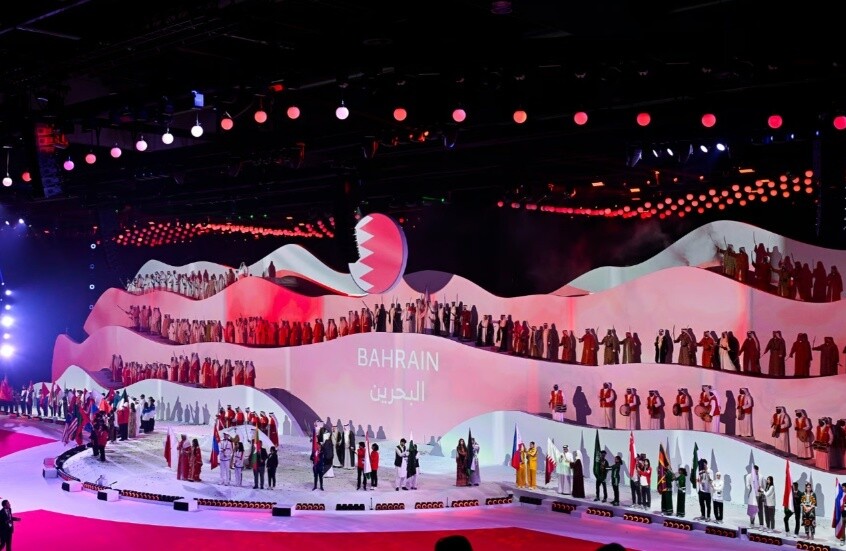شمل الحفل عرضا فنيا جمع بين الهوية البحرينية والتراث الآسيوي، ودخول طابور الدول المشاركة، حيث حظي الوفد البحريني باستقبال حار.