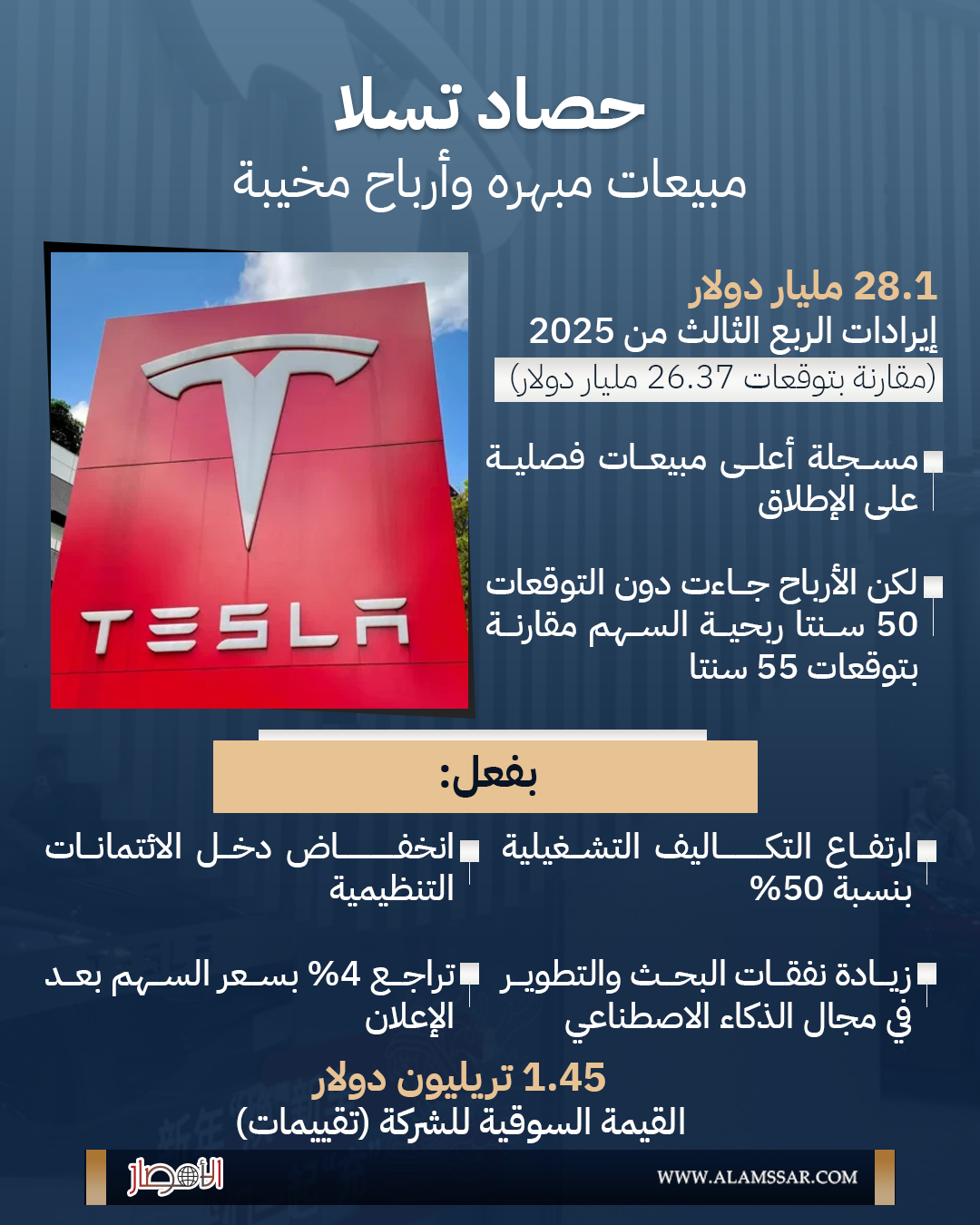 انفوجراف| بالأرقام.. حصاد تسلا مبيعات مبهره وأرباح مخيبة