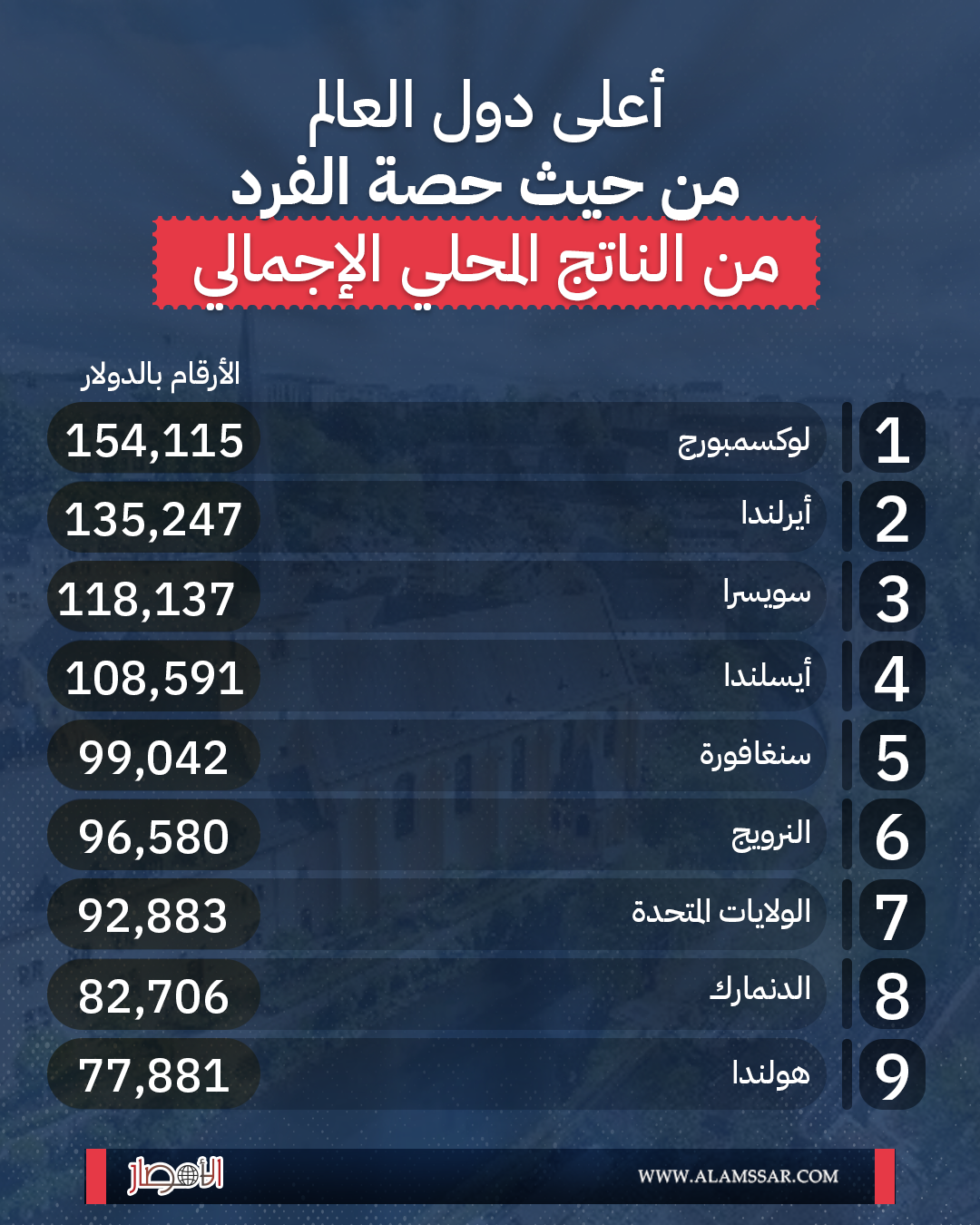 انفوجراف.. أعلى دول العالم من حيث حصة الفرد من الناتج المحلي الإجمالي