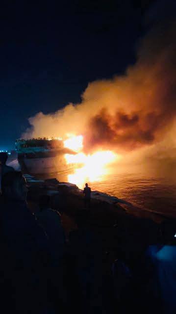 وتداول رواد مواقع التواصل الاجتماعي صورًا وفيديوهات تُظهر تصاعد ألسنة اللهب وأعمدة الدخان بكثافة من الباخرة.