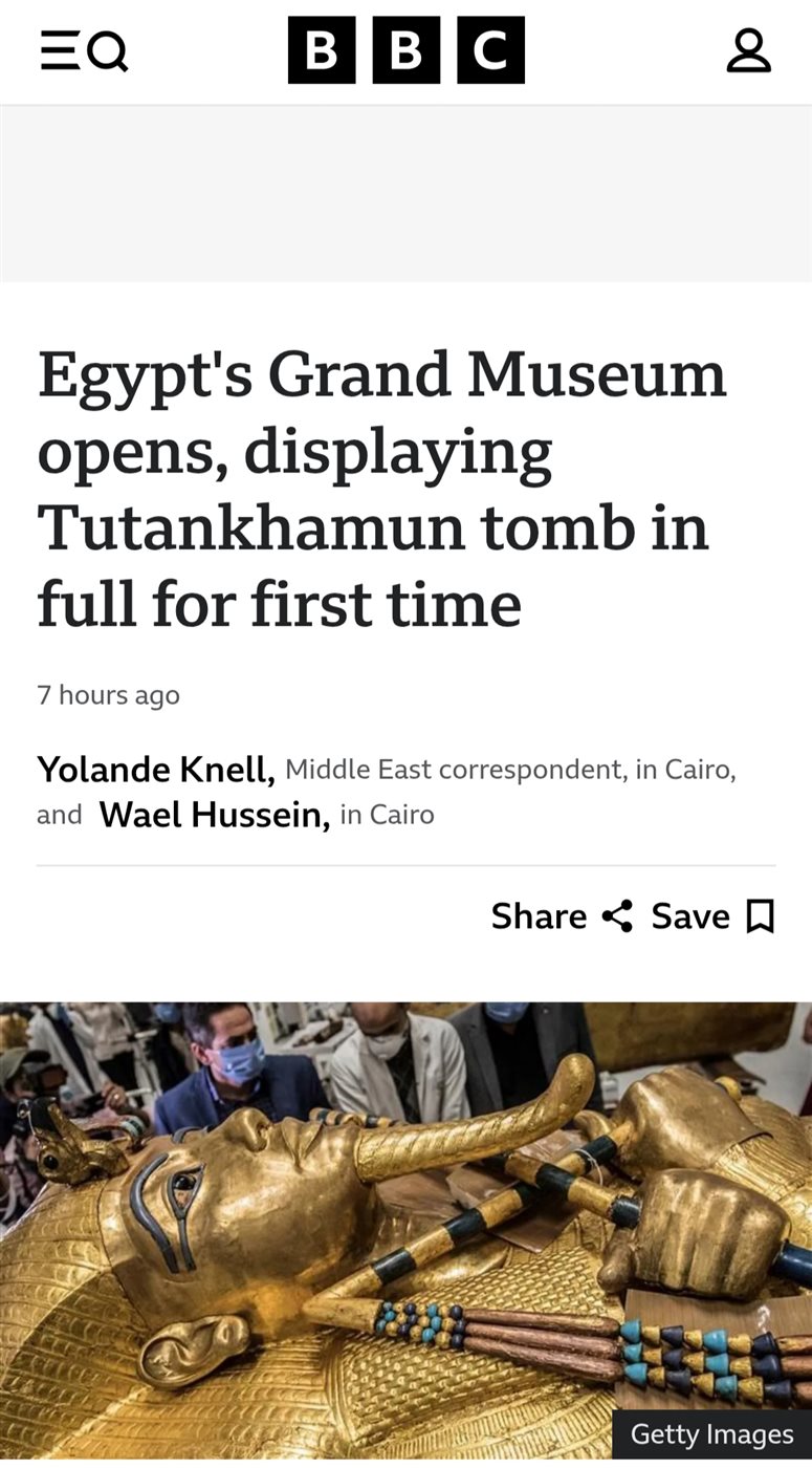 أما هيئة الإذاعة البريطانية "بي بي سي" فقد ركزت في تقريرها على أبرز عناصر الجذب في المتحف، وهي قاعات الملك توت عنخ آمون التي تُعرض لأول مرة كاملة منذ اكتشافها عام 1922 على يد عالم الآثار البريطاني هوارد كارتر.