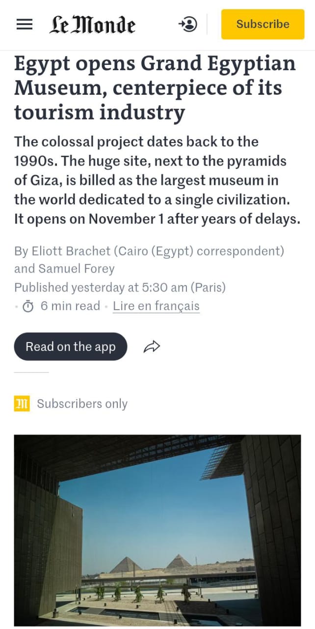 أما صحيفة "لوموند" الفرنسية، فقد وصفت افتتاح المتحف بأنه يمثل "نقطة تحول ثقافية واقتصادية لمصر"، مشيرة إلى أنه أكبر مشروع ثقافي في تاريخ البلاد. وأضافت أن المتحف المصري الكبير، الذي تجاوزت استثماراته مليار دولار أمريكي، يقع في موقع استراتيجي بجوار أهرامات الجيزة، ما يجعله محورًا أساسيًا في خطة القاهرة لتطوير السياحة الثقافية.