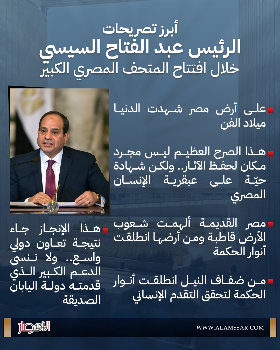 بالإنفوجراف| أبرز تصريحات الرئيس عبد الفتاح السيسي خلال افتتاح المتحف المصري الكبير