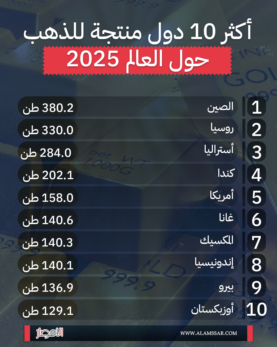 انفوجراف.. أكثر 10 دول منتجة للذهب حول العالم 2025