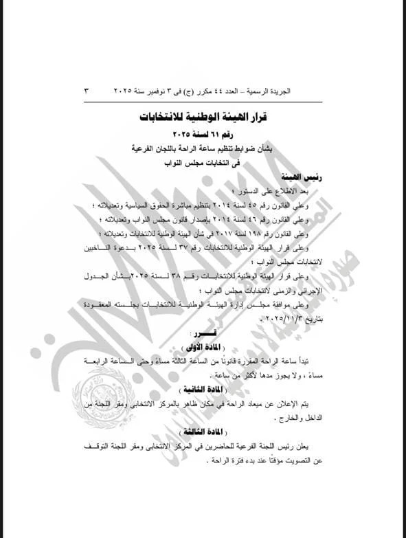 أصدرت الهيئة الوطنية للانتخابات برئاسة القاضي حازم بدوي، قرار بشأن الراحة المقررة قانونًا في انتخابات مجلس النواب 2025، والتي حددت من الساعة الثالثة وحتي الرابعة مساءًا.