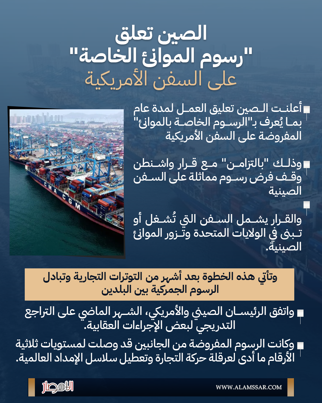 أعلنت الصين تعليق العمل لمدة عام بما يُعرف بـ"الرسوم الخاصة بالموانئ" المفروضة على السفن الأمريكية