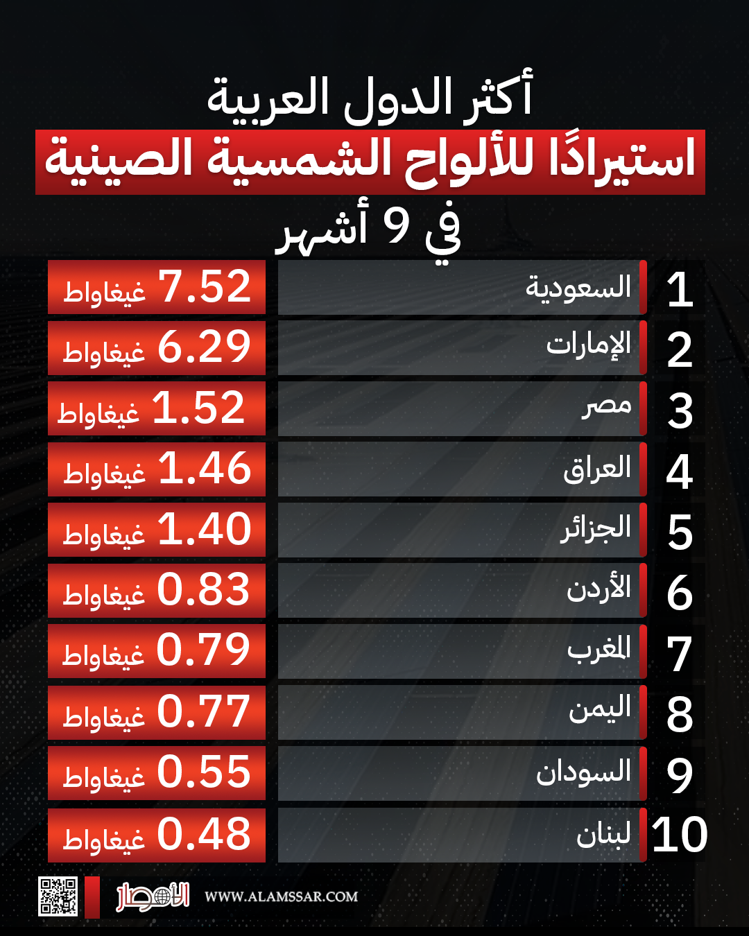 انفوجراف| أكثر الدول العربية استيرادًا للألواح الشمسية الصينية في 9 أشهر