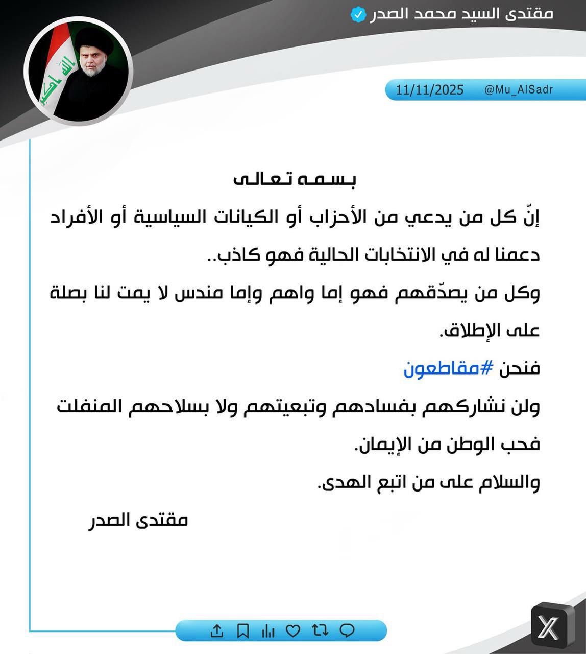 السيد مقتدى الصدر يوكّد مقاطعته للانتخابات البرلمانية العراقية في تغريده على منصة x