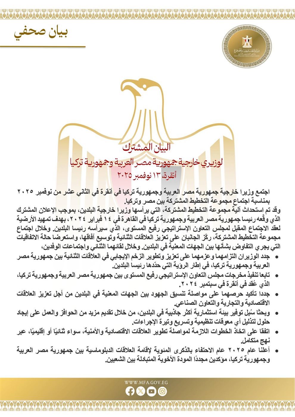 وأعلنا عام 2025 عام الاحتفاء بالذكرى المئوية لإقامة العلاقات الدبلوماسية بين جمهورية مصر العربية وجمهورية تركيا، مؤكدين مجددًا المودة الأخوية المتبادلة بين الشعبين.