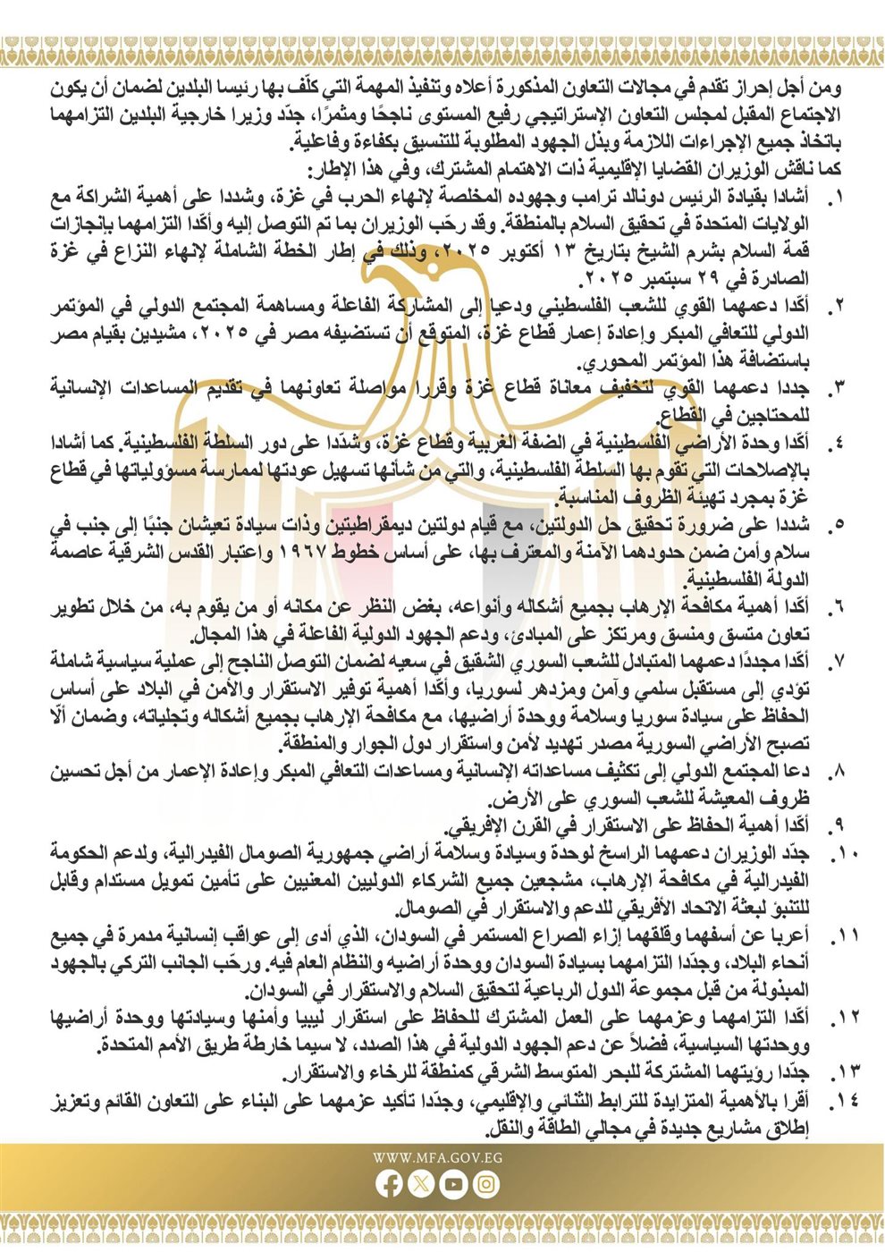 وقد رحب الوزيران بما تم التوصل إليه وأكدا التزامهما بإنجازات قمة السلام بشرم الشيخ بتاريخ 13 أكتوبر 2020، وذلك في إطار الخطة الشاملة لإنهاء النزاع في غزة الصادرة فى 29 سبتمبر 2025.
