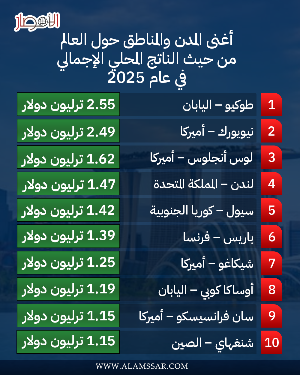 انفوجراف.. أغنى المدن والمناطق حول العالم من حيث الناتج المحلي الإجمالي في عام 2025