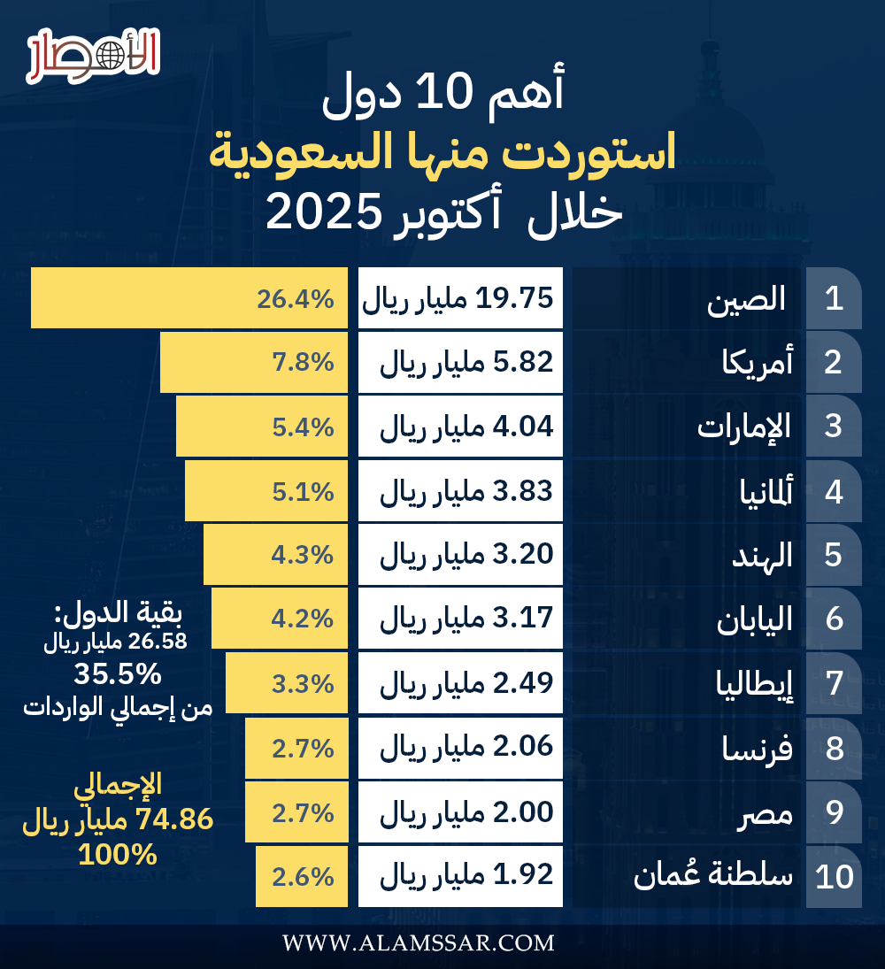 إنفوجراف.. أهم 10 دول استوردت منها السعودية خلال أكتوبر 2025