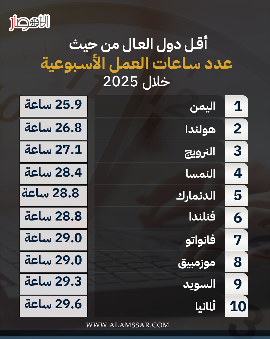 إنفوجراف.. أقل دول العالم من حيث عدد ساعات العمل الأسبوعية خلال 2025