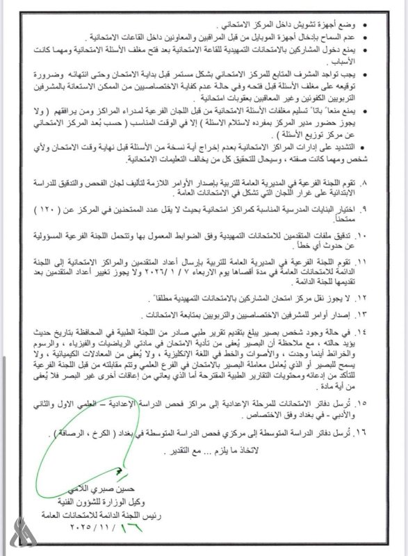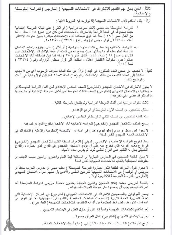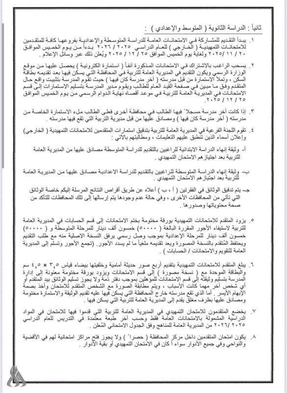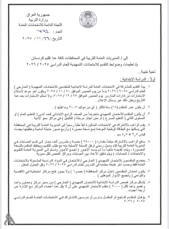 وأرسلت إلى المديريات العامة للتربية في المحافظات كافة عدا إقليم كردستان، مجموعة تعليمات وضوابط التقديم للامتحانات التمهيدية للعام الدراسي 2025/2026.