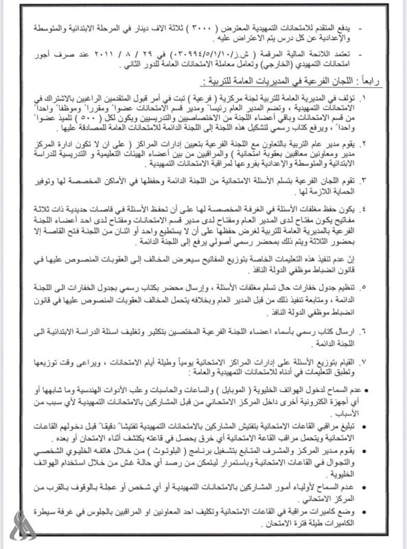 يكون امتحان المتقدمين داخل مركز المحافظة ( حصراً ) ولا يجوز فتح مراكز امتحانية في الاقضية والنواحي ( ولجميع الأدوار للمؤهلين )