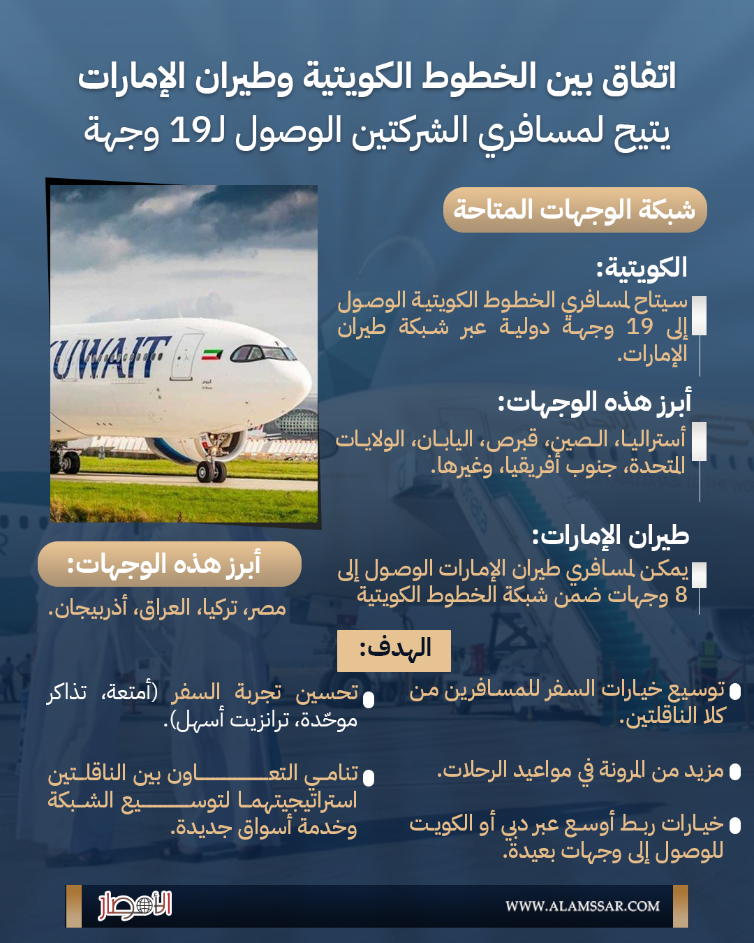 بالإنفوجراف.. اتفاق بين الخطوط الكويتية وطيران الإمارات يتيح لمسافري الشركتين الوصول لـ19 وجهة