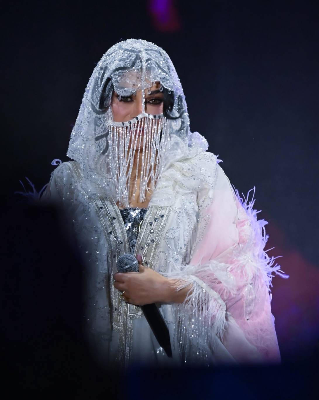 خلال أداء أغنيتها الشهيرة “أقول أهواك” بمشاركة فرقة السامري السعودية، ارتدت هيفاء عباءة طويلة مطرّزة بالريش فوق فستانها، كما غطّت وجهها بـ برقع أبيض لامع، في خطوة تفاعل معها الجمهور بحماسة كبيرة، مؤكدين إعجابهم باللمسة التراثية المبتكرة التي أضافتها “الديفا” إلى الحفل.