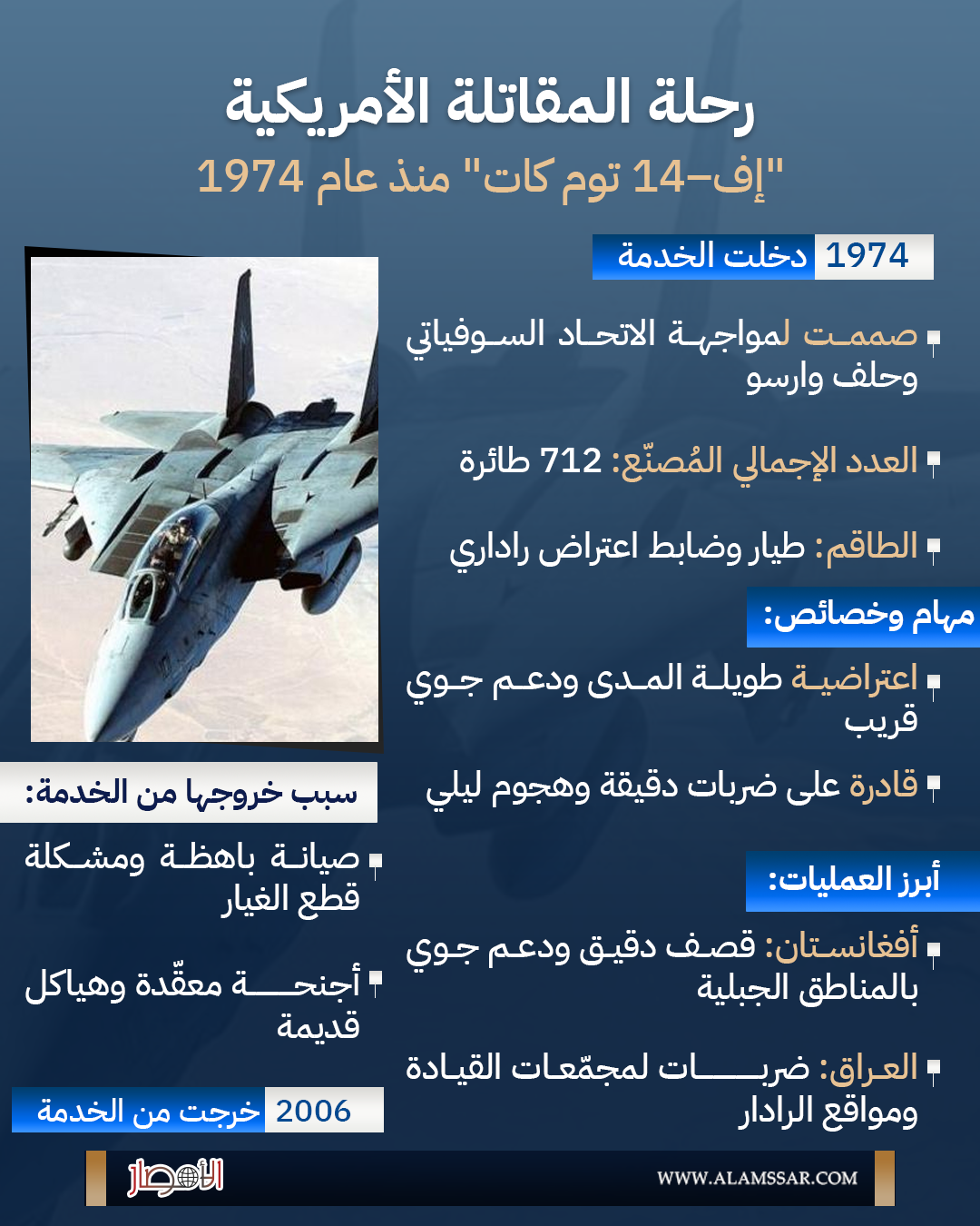 بالإنفوجراف| رحلة المقاتلة الأمريكية "إف–14 توم كات" منذ عام 1974