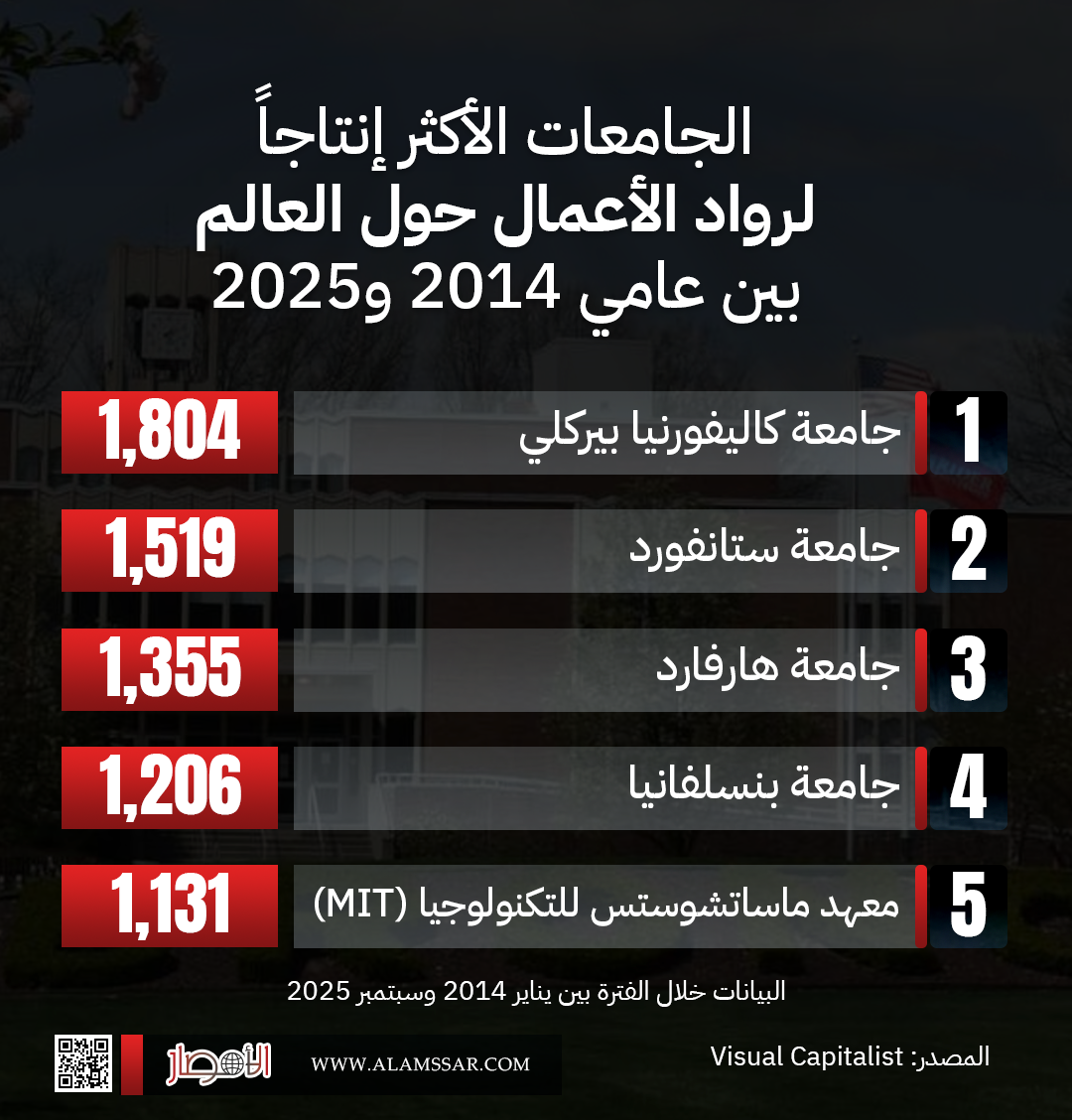 بالإنفوجراف.. الجامعات الأكثر إنتاجاً لرواد الأعمال حول العالم بين عامي 2014 و2025