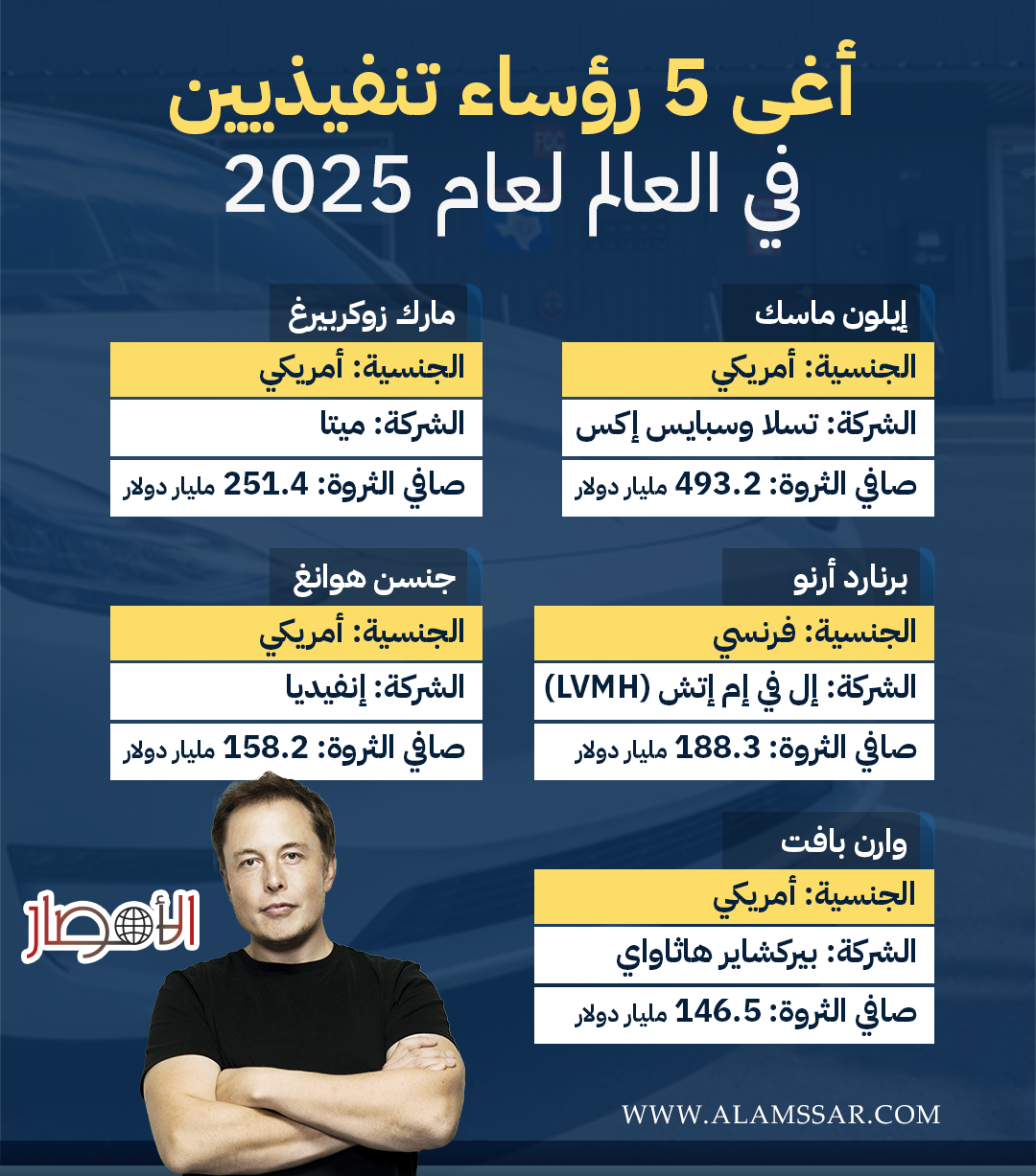 انفوجراف.. أغنى 5 رؤساء تنفيذيين في العالم لعام 2025