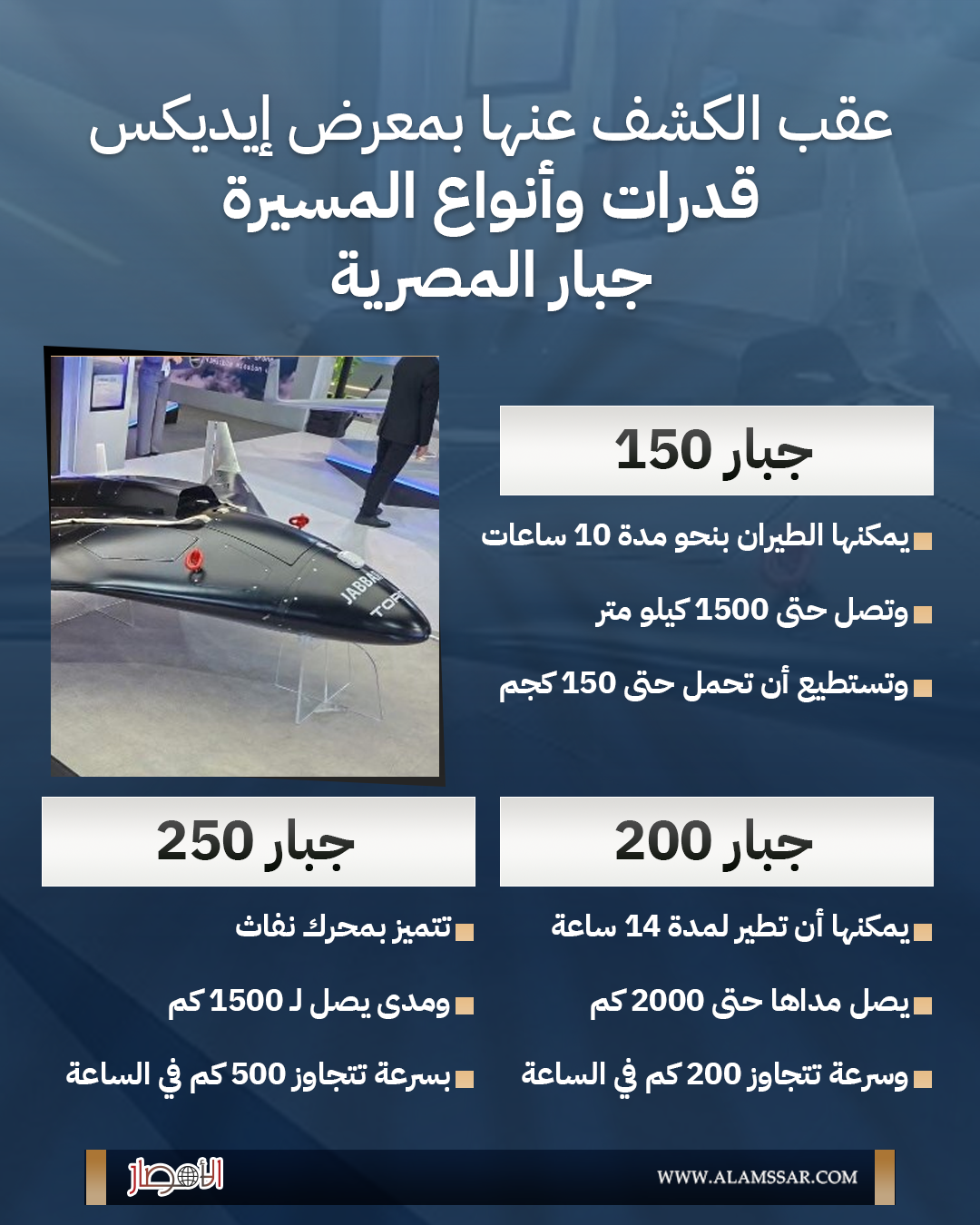 انفوجراف| عقب الكشف عنها بمعرض إيديكس.. قدرات وأنواع المسيرة جبار المصرية