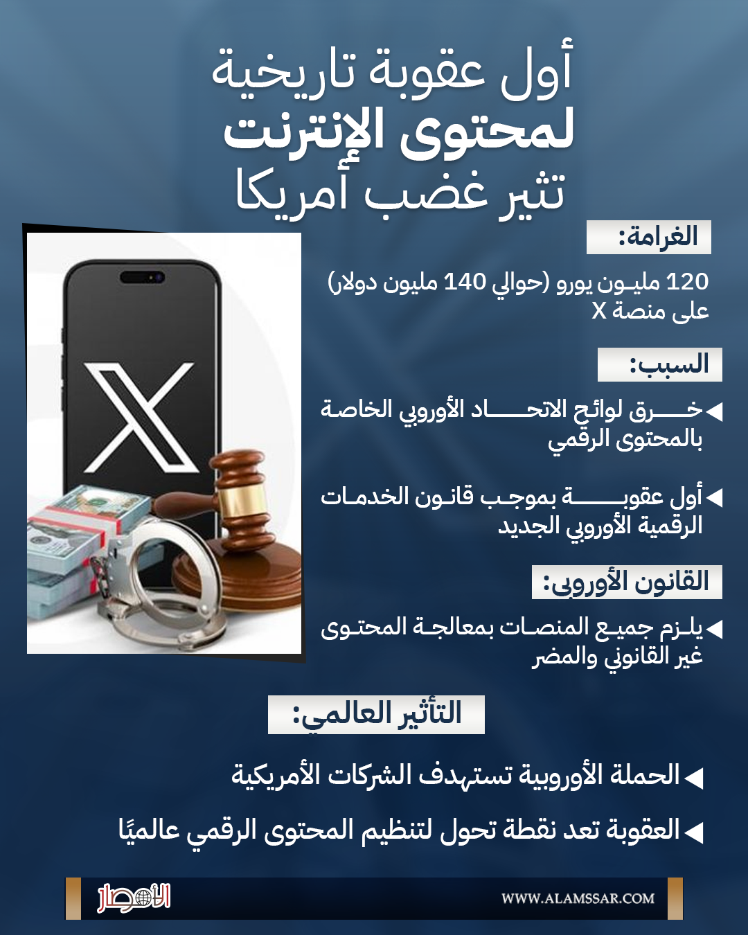 فرضت الجهات المنظمة لقطاع التكنولوجيا في الاتحاد الأوروبي غرامة مالية قدرها 120 مليون يورو، أي ما يعادل 140 مليون دولار، على منصة التواصل الاجتماعي "إكس" المملوكة للملياردير إيلون ماسك، وذلك بسبب مخالفتها لوائح الاتحاد الأوروبي المتعلقة بالمحتوى على الإنترنت.