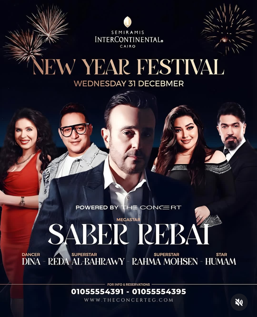 ويحيي صابر الرباعي، حفل رأس السنة في القاهرة مع الفنانين: (رحمة محسن، رضا البحراوي، همام إبراهيم، الراقصة دينا).