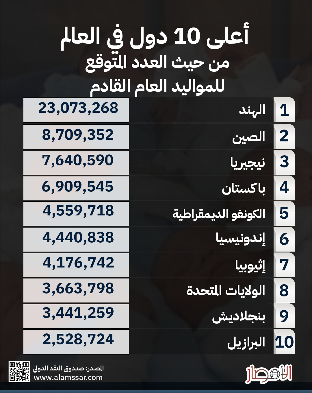 إنفوجراف| أعلى 10 دول في العالم من حيث العدد المتوقع للمواليد العام القادم