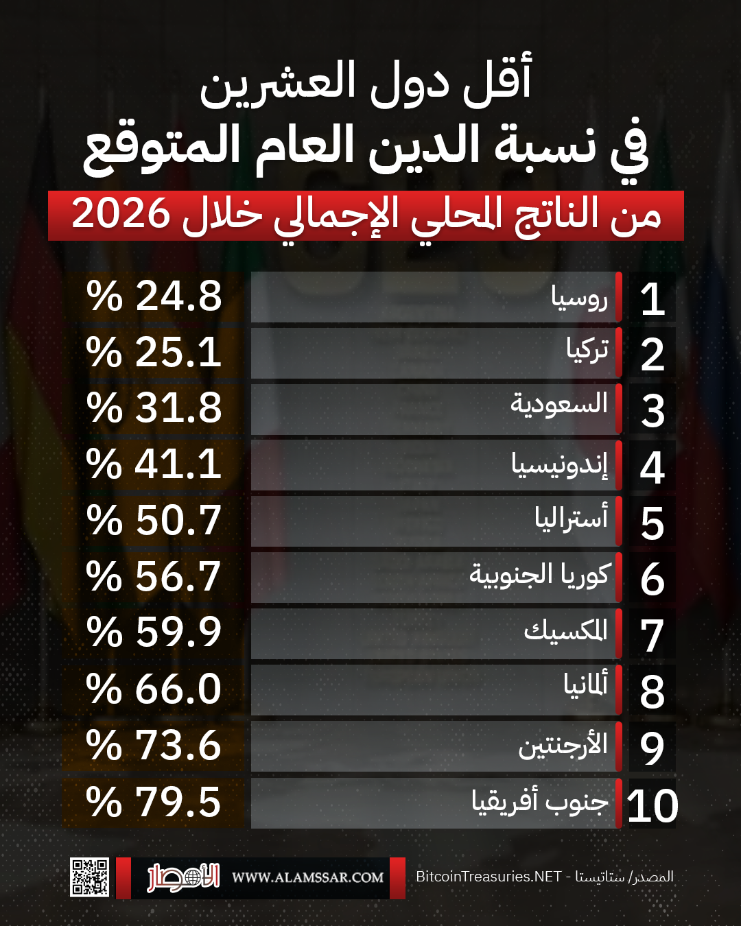 أقل دول العشرين في نسبة الدين العام المتوقع من الناتج المحلي الإجمالي خلال 2026